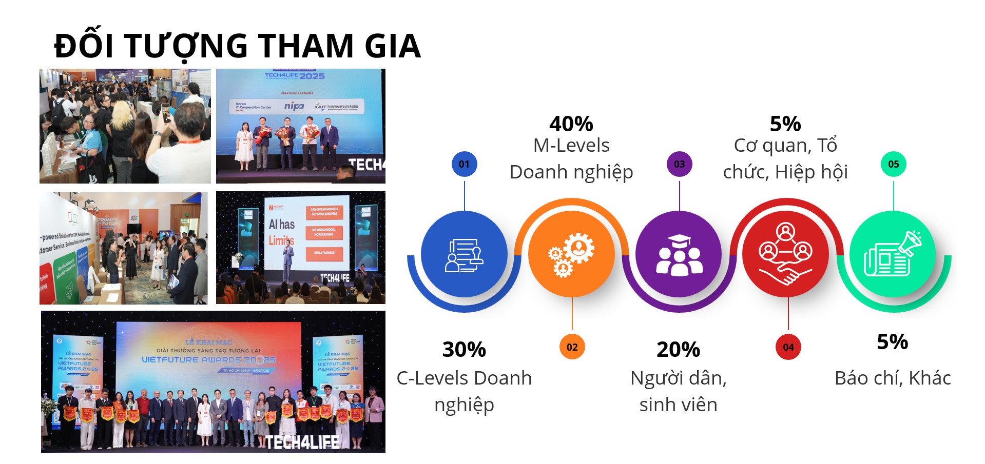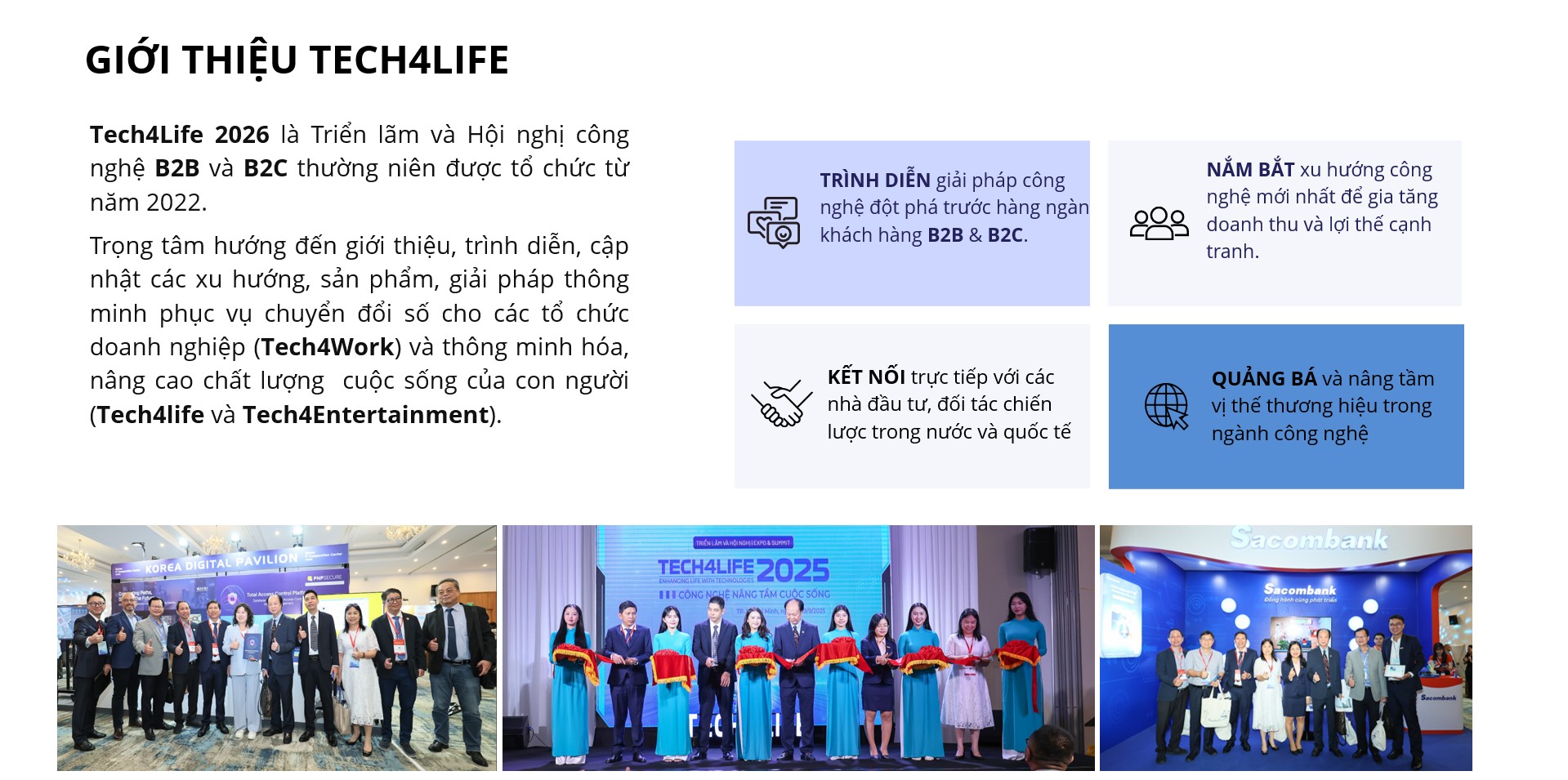 Triển lãm và Hội nghị Tech4life 2025 lần thứ 5 là sự kiện công nghệ thường niên với chủ đề “Công nghệ nâng tầm cuộc sống” dự kiến diễn ra vào ngày 17-18/09/2026 tại TP. Hồ Chí Minh. Hiệp hội Phần mềm và Dịch vụ CNTT Việt Nam (VINASA) và Sở Khoa học và Công nghệ TP. Hồ Chí Minh phối hợp tổ chức là hoạt động trọng điểm trong việc thúc đẩy ứng dụng công nghệ, phục vụ chuyển đổi số tổ chức doanh nghiệp và thông minh hóa cuộc sống của con người.